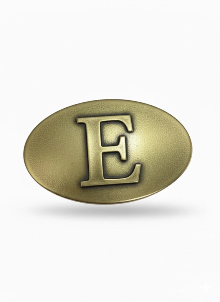 Hebilla oval de latón envejecido con letra E. Ideal para uso diario o regalo personalizado. Modelo CJ3610/1. Leer más...